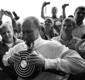 8月1日,在俄罗斯特维尔州,总理普京(中)在视察2011年度全俄“谢利格尔”青年教育论坛时尝试扳弯一口煎锅。新华社/路透
