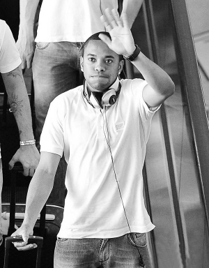 | 图为罗比尼奥走出北京首都国际机场时挥手向球迷致意。 小新发 |