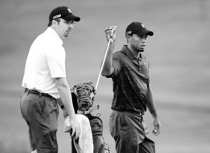 8月2日,美国名将“老虎”伍兹(右)与他的新球童贝尔在美国俄亥俄州阿克伦火石乡村俱乐部训练,备战总奖金850万美元的石桥邀请赛。 新华社发