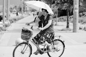 | 由于缺少绿荫,出行的市民在自行车上安装遮阳伞。 |