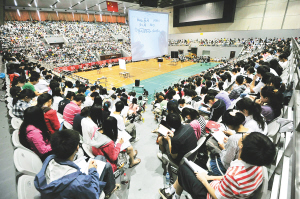 8月2日,众多学生在济南皇亭体育馆内上考研辅导课。 该考研辅导班由济南一家培训机构组织,为期1个月,共有约3500名学生同时上课,其中80%的学生来自济南的高校。主办方在体育馆内安装了3块投影屏,以便馆内每个角落的学生都能看到授课内容。为缓解上课压力,主办方还请来专业杂技演员在课间休息时表演,放松学生心情。不少参加辅导班的学生表示,时下就业压力较大,所以放弃了宝贵的暑假,投身到考研辅导大军中来,期待在来年的研究生入学考试中顺利过关,为将来成功就业添一份筹码。 新华社发(崔健 摄)