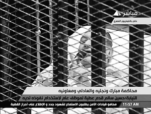 埃及国家电视台转播镜头捕捉到,穆巴拉克一会儿把双手垫在脑后,一会儿用胳膊遮住额头,与两个儿子贾迈勒和阿拉交谈。贾迈勒和阿拉显得较为镇静。