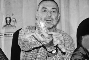 8月2日,在乌干达首都坎帕拉召开的新闻发布会上,法国法兰西学院的古生物学家马丁·皮克福德展示在卡拉莫贾地区发现的古猿类头骨化石。