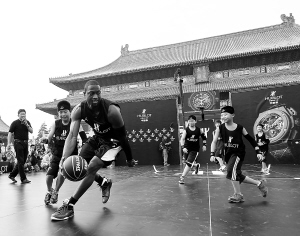 为慈善活动 NBA巨星韦德 北京太庙献球艺 8月3日,NBA球星德维恩·韦德在北京太庙举行的“百万人民币大投篮”活动上为慈善活动大秀球技与爱心。图为韦德(中)与小球迷一起玩篮球。 新华社发