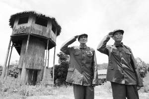 | 琼崖纵队老战士,毛阳镇番满村的王元盛(左)和什空村的王秋荣(右)在五指山革命根据地纪念园缅怀长眠的战友。