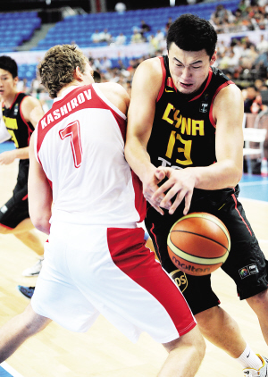 8月4日,在斯坦科维奇杯篮球赛海宁站季军争夺战中,中国队以49:50不敌俄罗斯队。中国队四战皆负,获得第4名。图为苏伟(右)在比赛中拼抢。新华社发