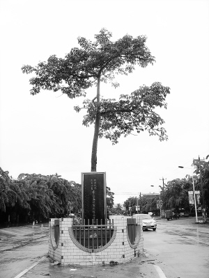 在海榆东线万宁牛漏路段,一株高大的木棉树矗立在公路正中央,树龄10年左右,有一圈1米高的栏杆将其紧紧护住,这棵路中央的树,常常引来过往游客好奇的目光。他们或许不知道,这其实是一株百年传奇将军树的老树新苗。