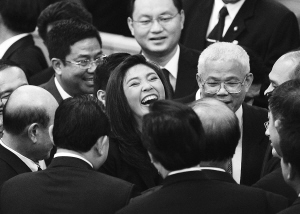 | 英拉(中)在当选总理后接受议员祝贺。 新华社/路透