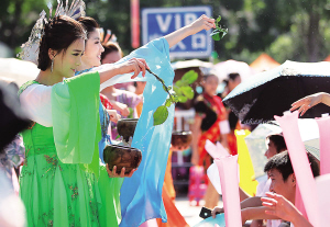 ← 八月六日,海南七仙温泉嬉水节活动现场,美丽的“七仙女”为嘉宾洒水祝福。 本报记者 张杰 摄