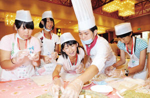 | ←8月6日,日本学生在三亚君澜度假酒店参加包饺子比赛。