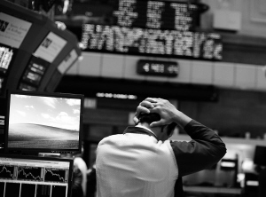 | 8月4日,一名交易员在美国纽约证券交易所的大厅里忙碌。当日,纽约股市道琼斯指数收盘暴跌500点以上,标准普尔指数跌约4.8%,纳斯达克指数跌幅超过5%。 新华社/路透 |