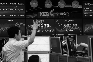 | 8月5日,受隔夜美国和欧洲股市全面下挫等因素打压,5日亚太地区主要股指应声下跌,集体重挫。韩国首尔股市综合指数下跌74.72点,收于1943.75点,跌幅为3.7%。 新华社发 |