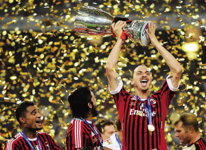 | 8月6日,在北京国家体育场(“鸟巢”)举行的2011意大利超级杯赛中,AC米兰队以2:1战胜国际米兰队,夺得超级杯。图为AC米兰队球员伊布拉希莫维奇(右二)在颁奖仪式上庆祝。 新华社发 |
