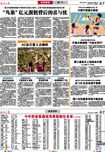 海南日报 体育新闻 综 合 007 2011-08-071 2011年08月07日 星期日