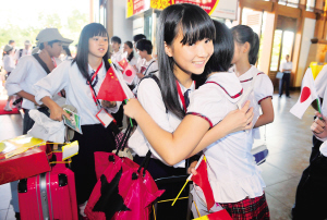 | 八月七日,结束“阳光海南,爱心传递”活动的日本灾区儿童恋恋不舍地离开海南。图为前来送行的三亚中学生和日本小朋友相拥在一起。
