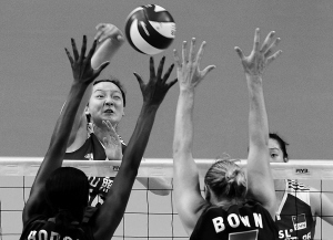 | 在世界女排大奖赛(漯河站)比赛中,中国队以0比3负于美国队。图为邱亚楠(上)在比赛中进攻。 新华社发