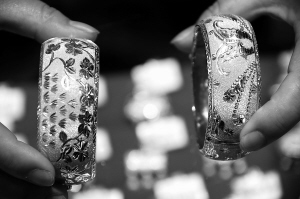 8月8日,在江苏连云港市一家金店里,工作人员在展示黄金饰品。 受美国主权信用评级遭标普下调影响,当日,在国际大宗商品市场方面,纽约黄金期货电子盘突破1700美元/盎司,创历史新高。 新华社发