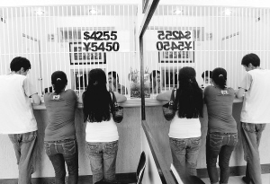 8月8日,在菲律宾首都马尼拉,人们在一个货币兑换点办理业务。