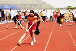 这边,在田径赛道上,戴着猪八戒面具的参赛选手们用特制的木板“驱赶”着两个椰子,奋力将这两头不听话的“小猪”赶进100米开外的“猪栏”。那边,在操场上,穿着传统民族服装的选手们分组站在圈内,两人同持一根棍棒,在不允许棍棒碰到身体的情况下,要完全靠手臂的力量将对方顶出圈外。