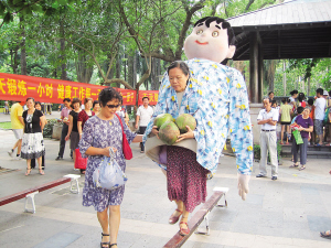 →海口市民在进行巨人抱椰子过独木桥游戏。