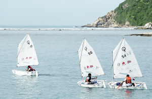 | ↓8月8日,几名少年驾驶小帆船向大海深处驶去。当日,2011年三亚市“全民健身”系列活动在鹿回头海湾举行,首次开办青少年帆船训练营。 本报记者 苏晓杰 摄 |