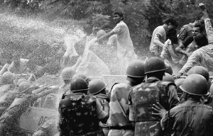 8月9日,在印度新德里举行的反政府抗议活动中,安全人员用高压水枪驱散人民党青年阵线成员。 当日,由人民党发起的反政府游行演变成暴力事件。抗议者们与警察发生冲突,后者动用了催泪瓦斯以控制局势。 新华社/法新