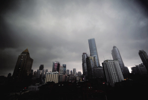 8月10日午后,暴雨侵袭南京主城区,天空乌云密布,尤如暗夜。 新华社发