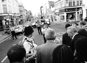| 8月9日,伦敦南部的克罗伊登,警察封锁骚乱中遭到破坏的街道。新华社发 |