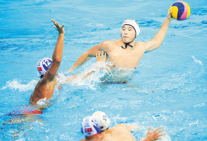 | 8月11日,第26届大运会男子水球比赛在深圳市宝安区揭开战幕。中国队在首场比赛中以14:7击败土耳其队,取得开门红。图为中国队选手董天艺(右)在比赛中进攻。 新华社发
