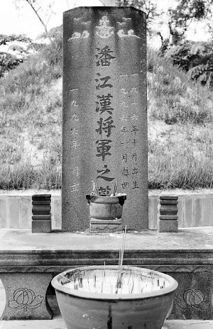 儋州市白马井镇城区的一块空地上,有一个面积不大的墓园,但其中高耸的坟茔煞是引人注目,墓碑上刻有“潘江汉将军之墓”等字样,背面是潘江汉的简介;墓园前方两侧的石柱上,刻着一副对联:“赤胆昭琼岛,雄风荡海疆。”在潘江汉墓的西侧,是清代乾隆年间儋州进士黄河清的坟墓。