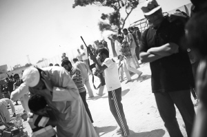 | 8月12日,利比亚反对派在班加西为在布雷加争夺战中死去的武装人员举行葬礼,一名反对派武装人员鸣枪致敬。 新华社/法新