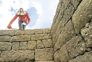 8月13日,海口市绕城公路边上的儒符石塔,文物技术人员正在测量登记,并将每一层塔身外墙的石块进行编号。 儒符石塔又称“涅槃塔”,现为省重点保护文物,位于海口市石山镇西北约一公里的儒符村,是一座建于宋代末年的佛教名塔,已历经800多年风雨。因年久失修,如今塔已坍塌,只剩台基台阶。海口市有关部门近日开始对石塔进行修缮和清理,将按照修旧如旧的方式,尽量恢复石塔原样。 本报记者 李英挺 摄