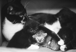 家猫给长尾虎猫当妈