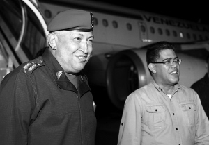 委内瑞拉电视台播放出的画面上,查韦斯身穿军装、头戴贝雷帽,在女儿罗莎·比希尼娅陪伴下走下飞机舷梯。
