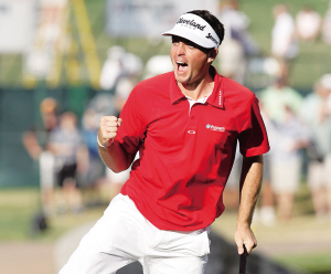 15日,在第93届美国PGA锦标赛最后一个比赛日,首次参加大满贯赛事的布拉德利通过延长赛,以领先一杆的优势战胜同胞杜夫纳,夺得冠军。图为布拉德利在第17洞打出一个长距离小鸟球后庆祝。 新华社发