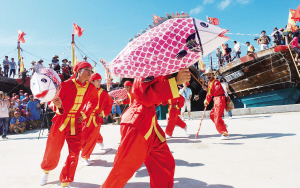 上午9点多,潭门中心渔港新码头,在一阵喧天锣鼓声中,潭门舞狮舞龙队开始表演,活灵活现的龙头、狮头不时向着大海鞠躬、行礼,寓意人类要敬畏大海尊重海洋。紧接着,今年刚申报省级非物质文化遗产名录的鲤鱼灯闹春表演上场。最隆重的是祭108兄弟公出海仪式,去年已被列入省级非物质文化遗产名录。10艘大渔船中的头船上,主祭人员在焚香、颂文等系列祭海仪式后,只听螺号声响起,头船开始起锚出航。