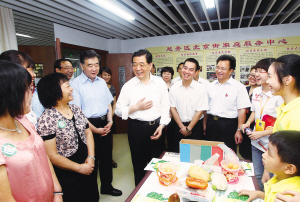 | 胡锦涛总书记在广州市越秀区盐运西社区同居民和社区工作者亲切交谈,了解社区开展便民服务情况。 新华社记者 兰红光 摄 |