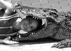 8月16日,在泰国首都曼谷以东120公里处的斯里拉差动物园,一位28岁的泰国女驯鳄师在为游客做惊险表演。 为了养家糊口,这位驯鳄师每天表演三场,月薪约为1000美元。 新华社/路透