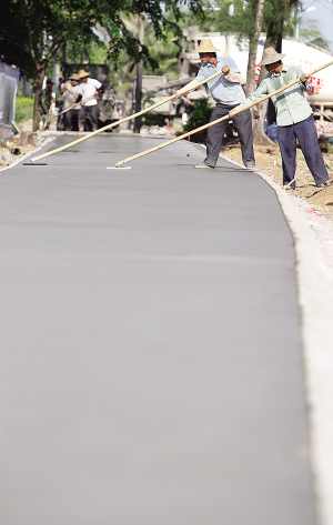 8月13日,海口市西海岸新建绿色慢行道,施工人员抹平路面。日前,《海口绿色慢行休闲系统规划》已经通过专家评审。绿色慢行道逐渐遍布海口城乡。 本报记者 李英挺 摄