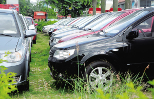 | 海口市南海大道两侧,各种品牌汽车停在经销商门前的露天场地。 本报记者 苏晓杰 摄 |