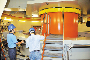 8月16日,三峡电站机组检修维护人员在机组内部检查。 当日,记者从三峡电厂了解到,世界最大水电站三峡电站累计发电量日前突破5000亿千瓦时。自2003年投产至今,三峡电站持续安全稳定运行,为我国经济社会发展提供了重要能源支持。 新华社记者 冯国栋 摄
