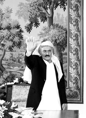 8月16日,也门总统萨利赫在沙特阿拉伯首都利雅得发表电视讲话后向镜头挥手。 当日,正在沙特阿拉伯疗伤的萨利赫在利雅得通过也门国家电视台向其支持者发表讲话说,他将“很快返回也门”。他在讲话中批评也门反对党联盟激化国内矛盾,号召通过选举来结束国内的政治危机。他还指责一些国家资助也门反对派。 新华社/路透