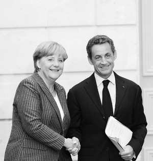| 8月16日,萨科齐(右)与来访的德国总理默克尔在总统府爱丽舍宫出席联合记者招待会。新华社发 |