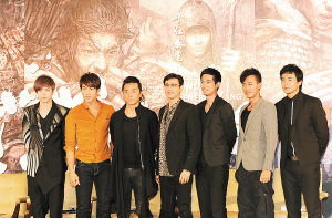 8月18日,《忠烈杨家将》主演付辛博、吴尊、郑伊健、郑少秋、周渝民、林峰、于波(从左至右)亮相电影新闻发布会。 当日,电影《忠烈杨家将》在北京举行新闻发布会,导演于仁泰携众主演亮相。影片中,郑少秋将出演杨家将最高统帅杨令公,郑伊健、于波、周渝民、李晨、林峰、吴尊、付辛博分别扮演杨家七帅(杨大郎到杨七郎)。据介绍,电影将于8月19日正式开拍。 新华社记者 覃海石 摄