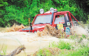 今天凌晨开始,三亚下起了雨,时大时小,一直持续到下午也没有停,汽车越野挑战赛就是在落雨纷飞中拉开了序幕。