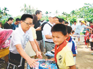 | 在定安县岭口镇封浩小学,“多背一公斤去远足”的“驴友”们给孩子们送上爱心礼物。