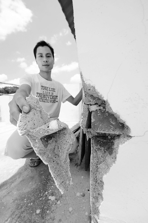 | 8月16日,村民在向记者展示爆裂的墙面。 新华社记者 李斌 摄 |