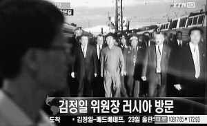 | 8月20日,在韩国首尔的一处车站,行人经过的电视机里正在播放朝鲜最高领导人金正日2002年访问俄罗斯的影像资料。 新华社/法新 |