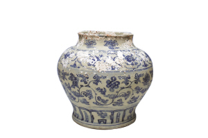 我们看到的这款青花大罐,圆唇、短颈、丰肩,腹部上鼓下收。颈饰祥云纹,肩饰折枝菊花,腹饰卷草花卉纹,足饰莲瓣纹。腹部和足部,内饰点缀八宝纹。此罐造型浑厚,纹饰简练华美,运笔娴熟,线条流畅。胎质洁白细腻,釉色莹润,一股恢宏气象扑面而来。端详青花大罐,犹觉永乐皇帝朱棣睥睨四海,威仪天下的大明雄风,在青花瓷的一泓碧彩下喷薄而出!
