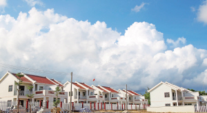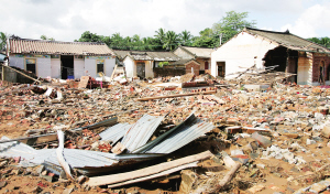去年遭遇特大洪涝灾害的文昌“水毁第一村”———文城镇陶坡村委会江村新村,经过不到一年的重建,如今,受灾群众陆续搬进了“别墅式”新房。小图为去年10月14日被洪水冲毁的江村。 本报记者 李英挺 特约记者 许环峰 摄